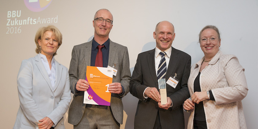 BBU-Vorstand Maren Kern verlieh Urkunde und Preisgeld für den ersten Platz an die Vorstandsmitglieder Norbert Reinelt und Matthias Löffler. „Netzwerk Nachbarschaft“ war das Thema des Wettbewerbs, bei dem die GeWoSüd den genossenschaftlichen Alltag von frühzeitiger Beteiligung der Bewohner bei Baumaßnahmen über das Engagement ehrenamtlicher Helfer bis zur Entwicklung des Mehrgenerationen-Wohnprojekts und die Pflanz-Aktion „Mein Baum“ berichtete. Auch das Aufleben der Nachbarschaftsaktivitäten wurde deutlich gemacht. Besondere Erwähnung bei der Preisverleihung fand das in Eigenregie betriebene Café am See – ein Treffpunkt für die Mitglieder, bei dem auch Alleinstehende versorgt werden, die nicht mehr für sich kochen können oder wollen.
